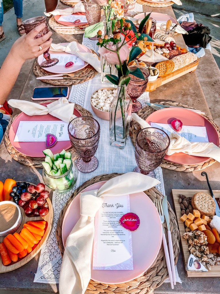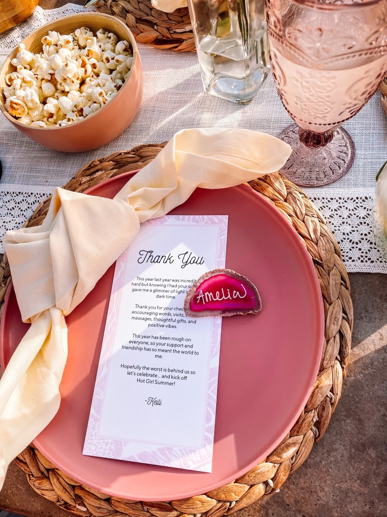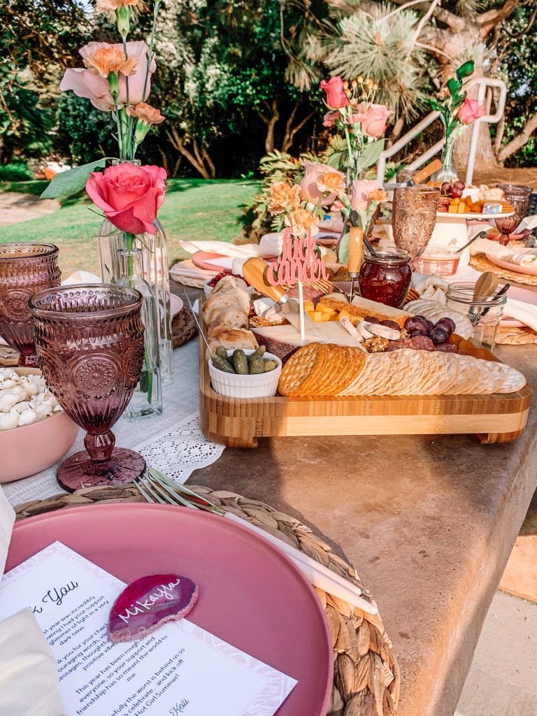 First of all, I love hosting and planning events, and this gave me something to dive my energy into besides work lately. There are tiny details, if you look closely, that I tried to put a lot of love into. I arranged the flowers myself (and then all my girls brought me bouquets of flowers themselves as a gift – they know me so well), stuck to a color scheme (pink is my current color obsession), designed “thank you” cards along with handwritten geode name tags for everyone’s table setting, bought an insane assortment of snacks for grazing boards (+ pizza duh), curated a playlist that included songs that reminded me of each of my guests from a specific memory with them, and had a cheeky “F Cancer” sign to remind us what we’ve been through. To top it all off Amelia made the most gorgeous candy platter of my dreams.