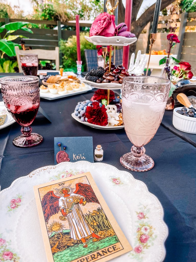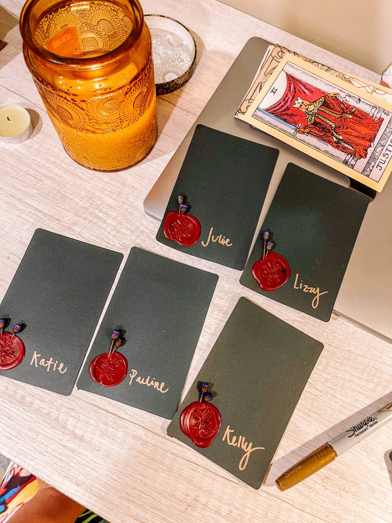 I bought a wax seal and dried flowers to create name tags, little potion jars of crystals, sage, a palm reader hand and a crystal ball. I also wrote down superstitions from around the world on the back of tarot cards for each guest to read aloud. Did you know in the Netherlands it’s considered bad luck to sing at the dinner table? It means you’re singing to the devil. I also had face jewels for everyone. We love a good face jewel. There were little moments that felt serendipitous throughout the night… maybe we channeled some witchy energy.