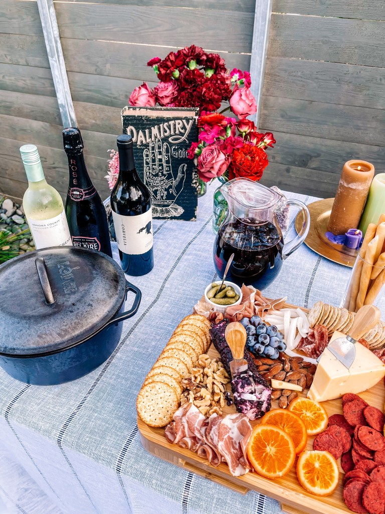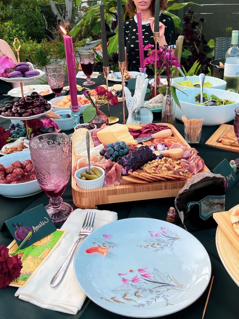 I recently found out my mother has a whole collection of vintage plates so I of course had to dig in the storage unit for them. I made deviled eggs, a gorgeous cheese board and alllll the Trader Joes appetizers. My friend brought homemade sour dough in a cauldron, which was so on theme. I lit candlesticks, arranged purple and dark red flowers, made black sangria and pretended it was a “midnight margarita”.
